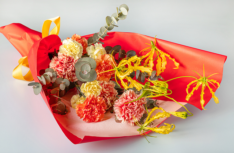 イエロー・オレンジ系のお花を使用した、華やかなブーケ