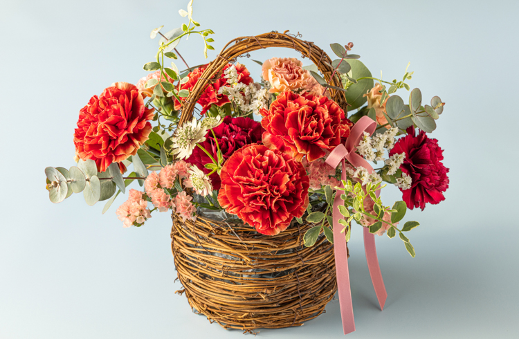 生花のカーネーションをふんだんに使ったバスケットアレンジメント。初心者の方にも丁寧にレクチャーいたします。