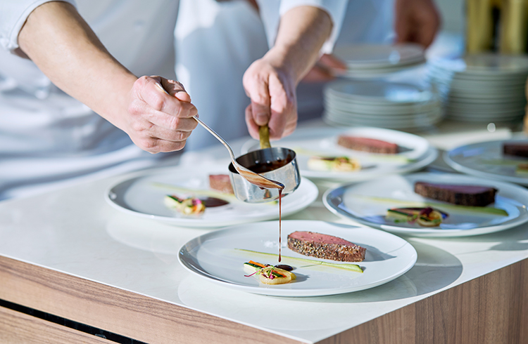 世界各国の賓客を感動させたシェフが創る美食。一流ホテルやレストランで研鑽を積んだシェフが創る見た目にも美しい料理。料理を最高の状態で提供できるように各会場には専用のキッチンを完備しています。