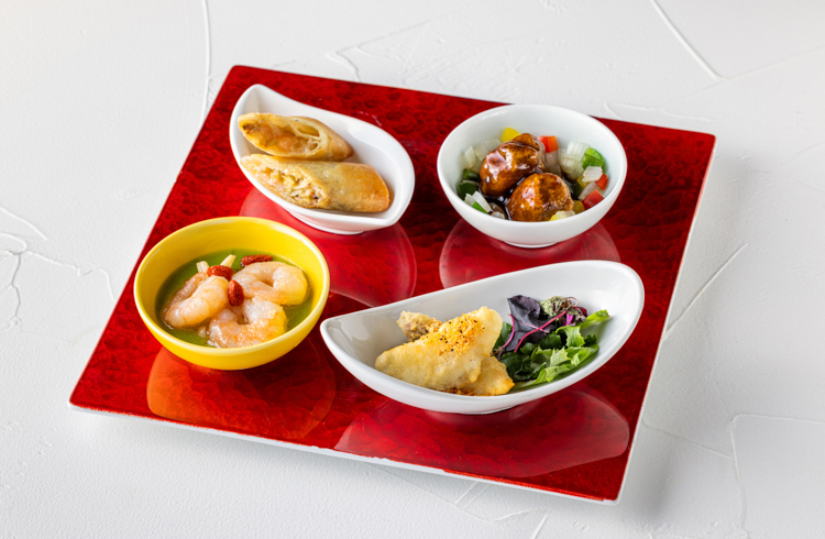 海老のグリンピースソース・イカ団子のチリソース・叉焼パイ・春巻