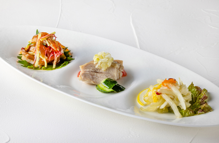 クラゲの冷製・蓮根の煎り付け・蒸し鶏のピリ辛黒酢ソース