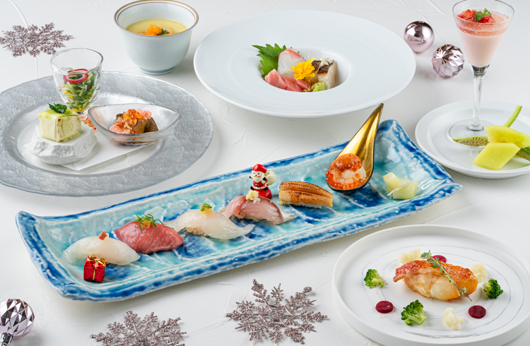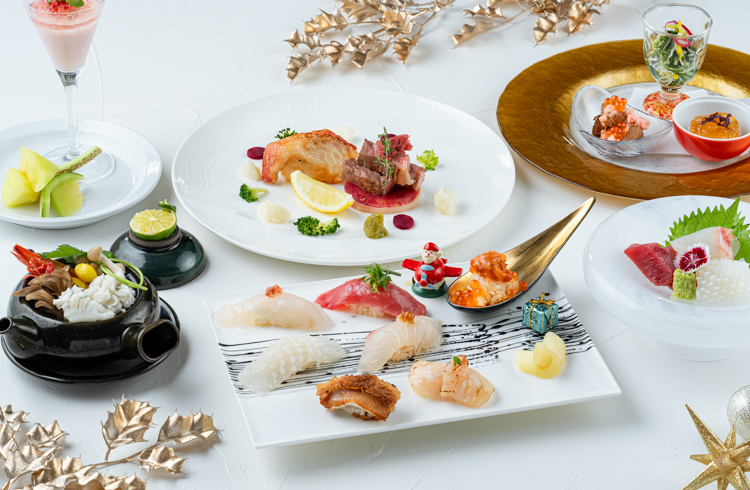 博多湾が眺望できるホテル最上階に位置するレストラン。料理長がクリスマスにふさわしい、贅沢なネタを厳選いたしました。日本酒や地酒、ワインにも合う、料理長の職人技が光るお料理の数々をお楽しみください。