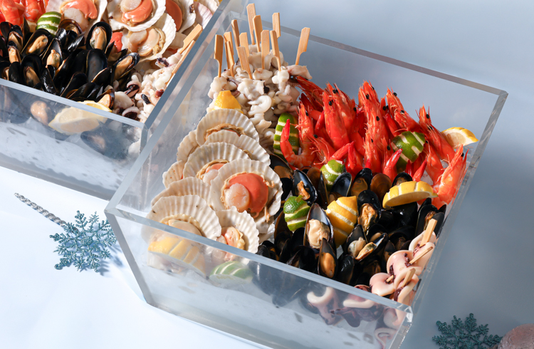 地元の新鮮な食材を使用し、豊富なメニューを取り揃えたビュッフェ。クリスマスに欠かせないチキンローストやシーフードカクテル、おまかせ寿司バーやステーキステーションなど、華やかな品々を心行くまでお楽しみください。
