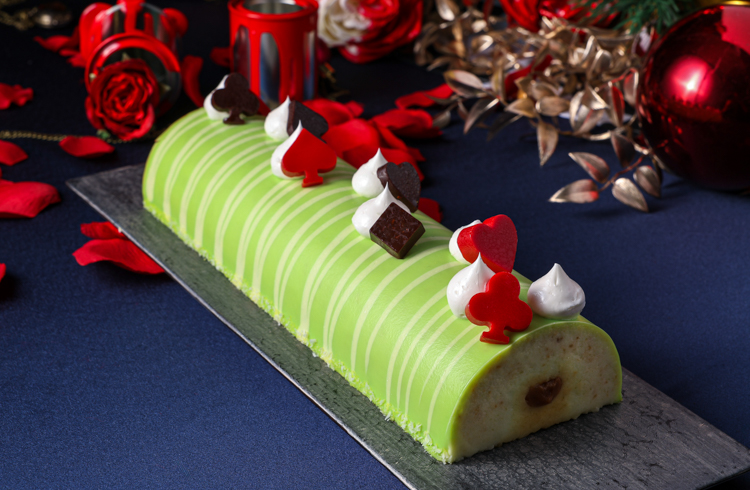 青りんごのムースとキャラメルを層にし、トランプ兵に見立てたチョコレートをあしらいました。慌てて庭の白いバラを塗り替える様子を表現したスイーツです。