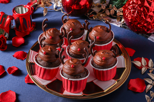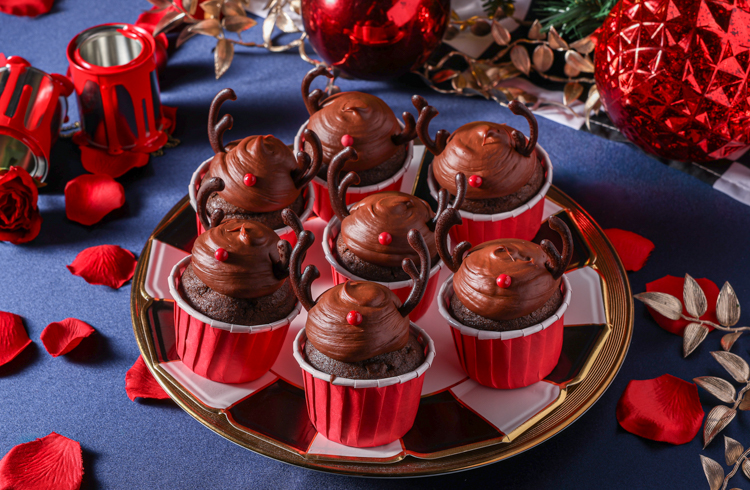 しっとりとしたチョコレート生地のカップケーキにビターチョコレートのクリームを絞り赤鼻のトナカイを模ったクリスマスシーズンにピッタリの一品。
