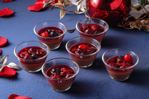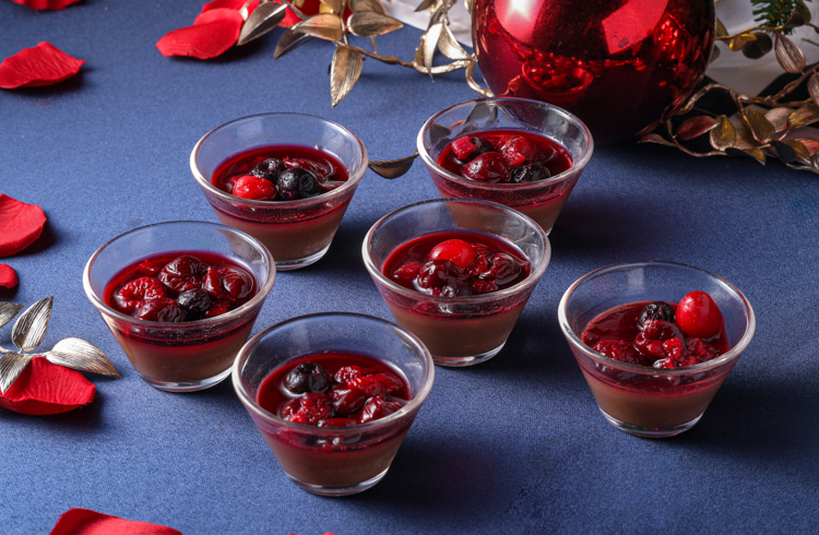 誰もがつい誘惑に負けてしまう、見た目にも美しいデザート。リッチなポ・ド・クレーム・ショコラと甘酸っぱいベリーコンポートが大人な味。