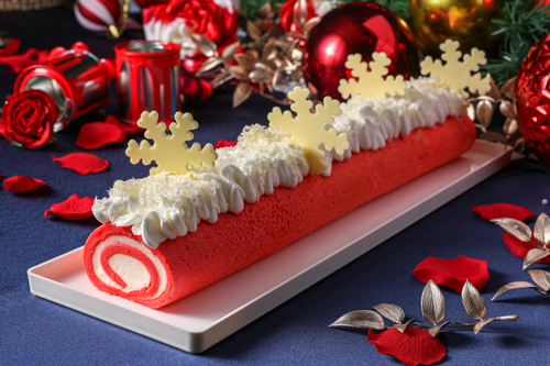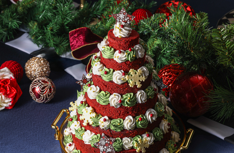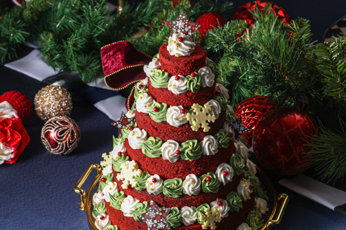 しっとりとしたレッドベルベットケーキの生地を重ね、クリームチーズフロスティングとミントクリームを絞り、星や六花を模ったチョコレートをオーナメントの様に飾ったケーキ。
