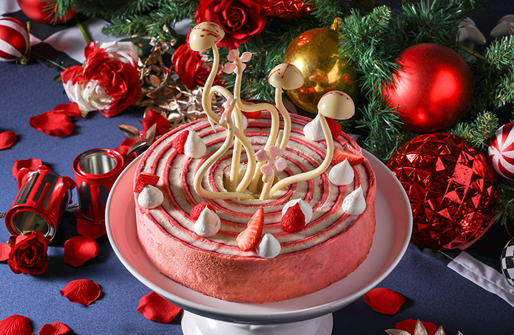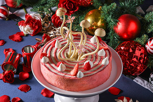 アリスが食べたマッシュルームをイメージしたロールケーキ。酸味の強いラズベリージャムと甘いヴァニラのガナッシュをスポンジで巻き、仕上げにフレッシュないちごをあしらいました。