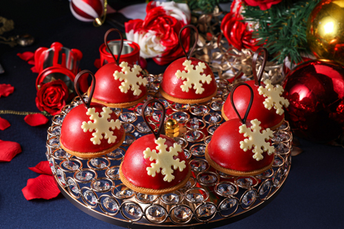 クリスマスオーナメントに見立てたチョコレートムースの中から木苺のジャムの爽やかな酸味を感じる一品。赤色が一番好きなハートの女王をイメージしたムースです。