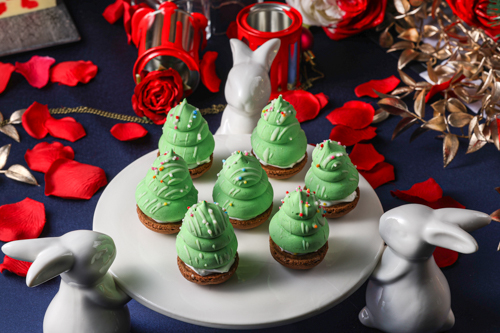 チョコレート風味のマカロンの上に薄くレモンバタークリームを塗り、クリスマスツリーに見立てた乾燥メレンゲを配したスイーツです。