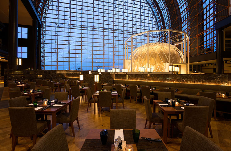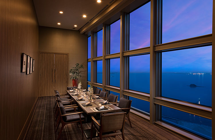 日中はアフタヌーンティーが楽しめるダイニングとして、夜は落ち着いた雰囲気のバーへと姿を変える、洗練された空間。ホテル最上階から眺めながら、カナッペとともに、バーテンダーのセンスが光るオリジナルカクテルなどがご堪能いただけます。